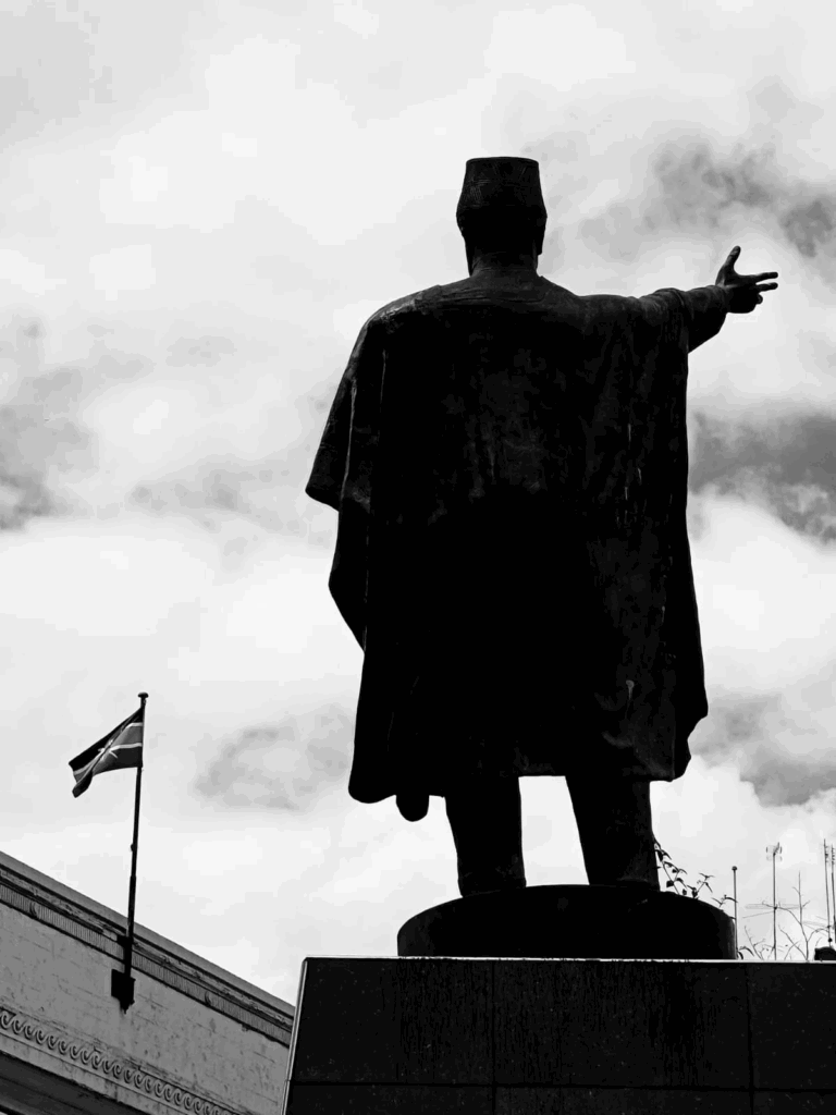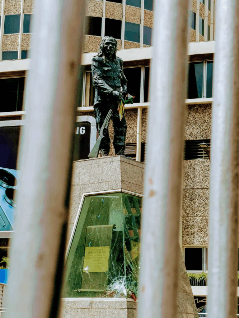 A turn onto Dedan Kimathi Street signals a shift — a new chapter in Kenya’s story. There, Dedan Kimathi stands mid-stride, bearing the symbols of the struggle — and not just his gun. In one hand, a flag — in the other, a handkerchief — recent additions by the people. The glass casing around his monument is shattered, possibly by a teargas canister or a stone. His jacket bears streaks of color from the water-based pepper spray the police used to deter protesters during the Gen-Z revolution just a year ago. 62 years after “independence”, the struggle continues.